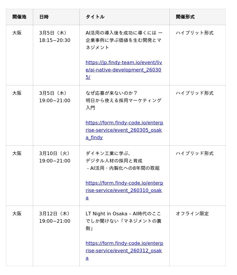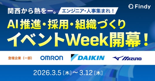 エンジニアプラットフォームを提供するファインディ株式会社(東京都品川区、代表取締役:山田 裕一朗、以下「当社」)は、国内大企業における内製化の高まりと、関西拠点のエンジニア求人が直近2年間で大幅に増加していることを受け、関西企業を支援する特別企画「関西企業を応援するイベントWeek」を開催いたします。