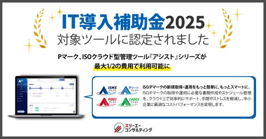 Pマーク、 ISOコンサルにおける支援実績 No.1(注1)のISO/Pマークの取得・運用支援サービス「認証パートナー」を提供する株式会社スリーエーコンサルティング(本社:大阪府大阪市、代表取締役社長:竹嶋 寛人)が、IT導入補助金2025の「IT導入支援事業者」に認定されました。
