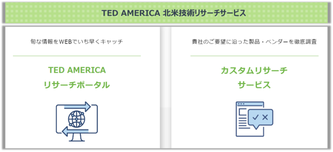 「TED AMERICA北米技術リサーチサービス」ではお客様のニーズに合わせて「TED AMERICAリサーチポータル」「カスタムリサーチサービス」の2つのサービスを提供します。