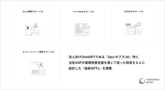 株式会社クロス・オペレーショングループ先端技術と業務(Ops)の融合に強みを持ち、生成AIを活用した業務改善支援を行う株式会社クロス・オペレーショングループ(東京都千代田区、代表取締役:田中亮大、以下XOP)は、自社で開発する法人向けChatGPT「OpsAI」(オプスAI)内に、独自プロンプトを搭載させたGPTsとして、【Excel関数サポートAI】【マクロ作成サポートAI】【GAS作成サポートAI】【スプレッドシート関数サポートAI】の提供を開始したことをお知らせいたします。※Ops / オプス=Operations / オペレーションの略称