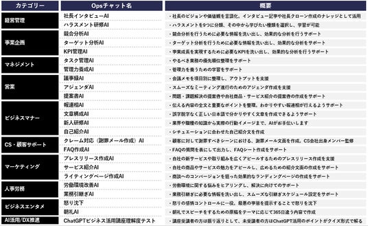 今回リリースした4つ以外にも、既に法人向けChatGPT「Ops(オプス)AI」には当社独自開発のGPTsが搭載されています。