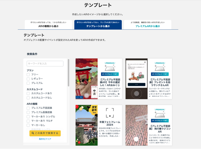 2. テンプレートから、「年賀フォトフレーム2024」または「【プレミアム平面認識AR】今年の運試しに!ARおみくじ」を選択