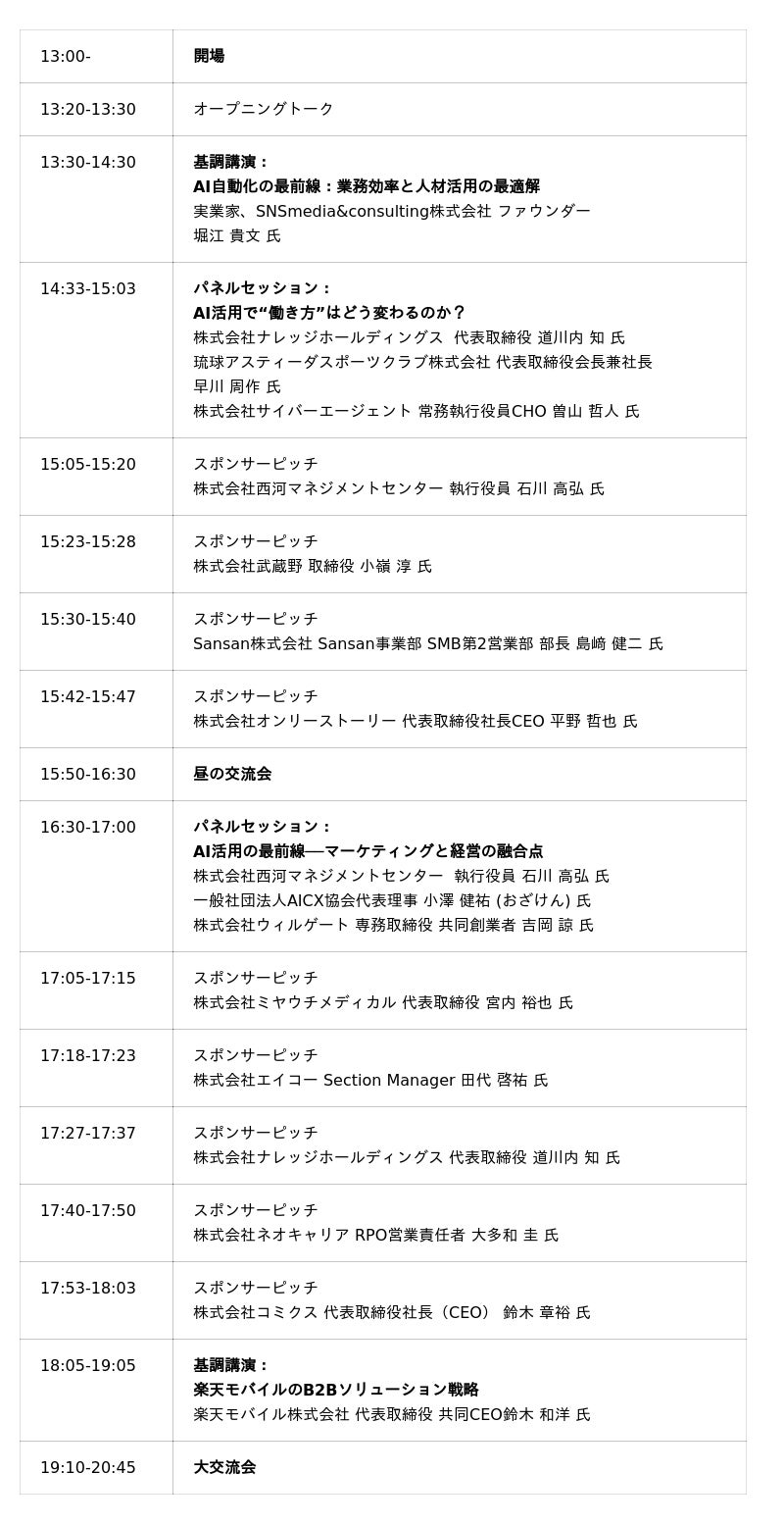 本カンファレンスでは、実業家の堀江貴文氏や楽天モバイル株式会社代表取締役 共同CEOの鈴木和洋氏をはじめ、さまざまな業界の経営者や専門家が登壇します。基調講演では、AIがもたらす業務効率化や新たなビジネス機会について、多角的な視点からご意見を提供いただきます。また、2つのパネルディスカッションでは、経営におけるAI活用の最新事例や、AIを活用した組織・個人の可能性を引き出す手法、AIとマーケティングの融合など、企業経営に直結するテーマで幅広く議論します。これらのセッションを通じて、来場者は実践的な知見を得ることができるとともに、自社の成長に向けたヒントを得る機会となります。