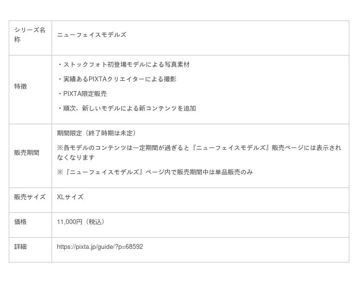 広告等の使用で他社との「モデル被り」を避けたいニーズに応え、使いやすいテーマの写真素材でありながら、初出しモデルであることや一定期間のみの販売である希少性をもって、従来のPIXTAの価格帯と一線を画し、単品価格11,000円(税込)で販売いたします。