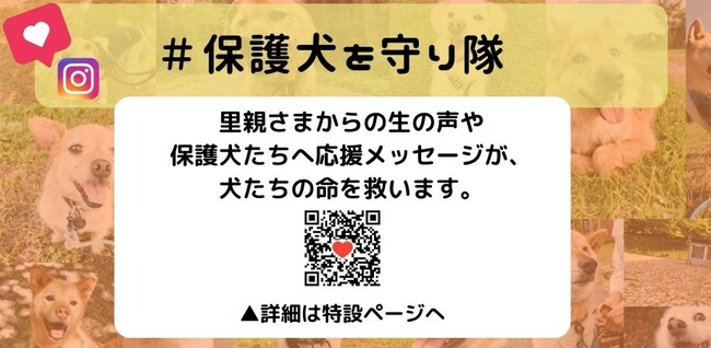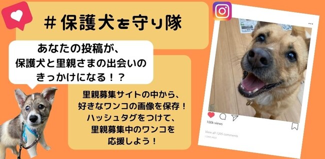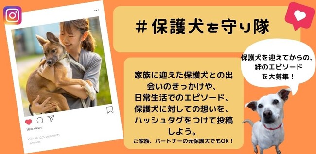里親募集中のワンコや、家族に迎えた元保護犬の写真をInstagramに投稿して、保護犬の「命」を繋ぐキャンペーンに参加しよう!合言葉は、ハッシュタグ「 #保護犬を守り隊」