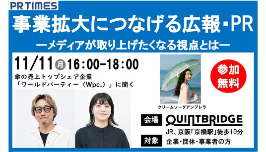 「QUINTBRIDGE(クイントブリッジ)」で開催(主催:PR TIMES、後援:神戸新聞社、アンカー神戸)。男性日傘のイメージを変え、事業拡大に貢献する広報・PR活動の方法について、累計30万本を突破した大ヒット商品