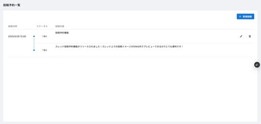 予約した投稿が一覧で確認でき、予約済みのスレッド投稿の内容編集・削除が可能。