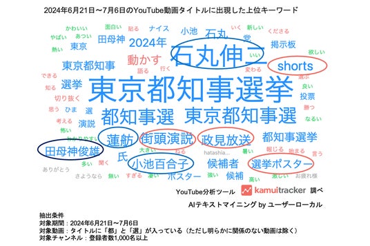 次に、2024年6月21日から7月6日までの選挙期間中、都知事選に関連するYouTube動画で、タイトルに入っていた文言を分析しました。下記は登場回数の多かったキーワードを視覚的に表現したものです。下記に挙がった文言はとりわけ上位に入るものですが、その中でも多いものが大きく表現されています。