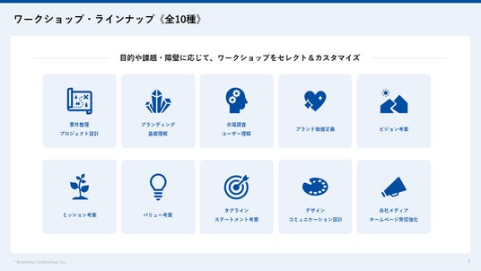ブランディングテクノロジー株式会社(代表取締役社長:木村 裕紀、本社:東京都渋谷区、証券コード7067、以下当社)は、中堅・中小企業様のブランディングの取り組みにおける陥りやすい課題に対応したブランディングワークショップ《全10種》をリリースしました。