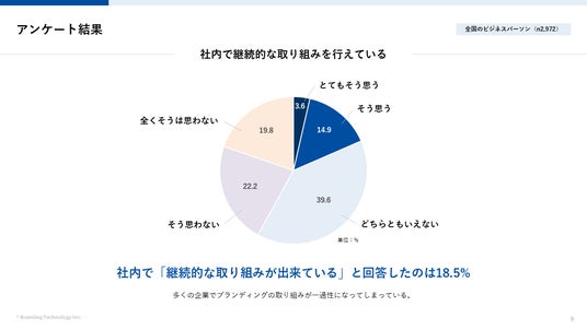 ブランディングに関する意識調査」を実施しました。調査内で「社内で継続的な取り組みを行えている」と回答したのは全体(n2,972)の18.5%に留まっています。多くの企業ではブランディングを継続できておらず、様々な課題を抱えていることが分かりました。