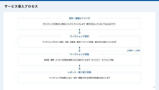 まずは、ブランディングの視点から現状についてヒアリングします。この際に要件が定まっていなくても問題ありません。ヒアリングから最適なプランをご提案させていただくことも可能です。次に、ワークショップのゴール設計、内容、対象者、事前アンケートの有無、進め方などを設計していきます。ワークショップ開催時には参加者、講師・メンターの対話を重視しながら進めていきます。※オンライン・オフライン可能