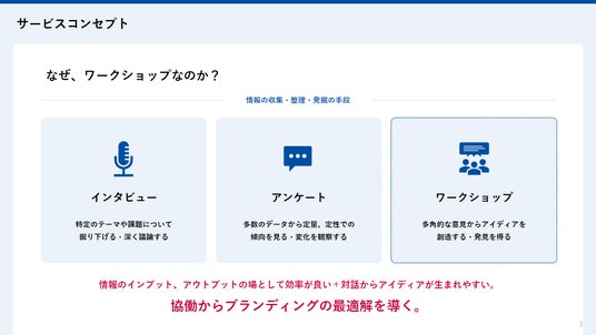 ブランディングを進める際に、情報収集や整理、発掘の手段として「インタビュー」「アンケート」「ワークショップ」があげられます。どの手段を取ってもブランディングを進めていくことは可能です。本サービスでは、情報のインプット、アウトプットの場として効率が良い点、対話からアイディアが生まれやすいという点からワークショップ形式でのプログラム開発を行っています。