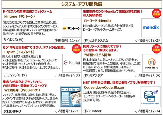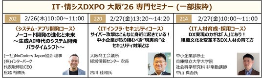 本展では、業界の有識者を講師に迎えた「専門セミナー」も同時開催する。システム・アプリ開発コースでは、(一社)NoCoders Japan協会 理事 舩越裕勝氏が、システム開発における人材不足を解消するノーコード開発の進化や業務活用事例を紹介、またITインフラ・セキュリティコースでは、サイバー攻撃対策の支援を行う大阪商工会議所 経営情報センター 次長 古川佳和氏が、中小企業が取り組むべき現実的なセキュリティ対策について解説するなど、情報システム・システム部門はもちろん、DXを推進する経営者必聴のセミナーが多数開催される。