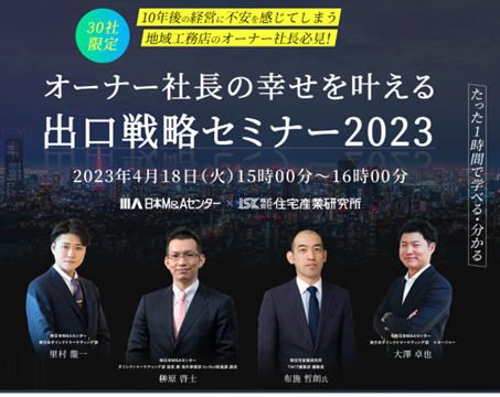 株式会社日本M&Aセンター(以下、日本M&Aセンター、本社:東京都千代田区 / 代表取締役社長:三宅 卓 / URL:https://www.nihon-ma.co.jp/)は、4月18日(火)にオンラインで、地域工務店のオーナー社長に向け、住宅業界の最新トレンドや、M&Aが盛んになりつつある建設業界の出口戦略を解説するセミナーを開催いたします。