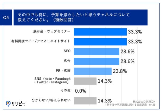 「Q5.その中でも特に、予算を減らしたいと思うチャネルについて教えてください。(複数回答)」(n=21)と質問したところ、