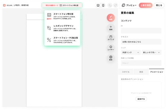 https://leango.co.jp/dejam/ )」がLP制作機能でレスポンシブ型、デバイス独立型、スマートフォン特化型を選べるアップデートを実施したことをお知らせいたします。