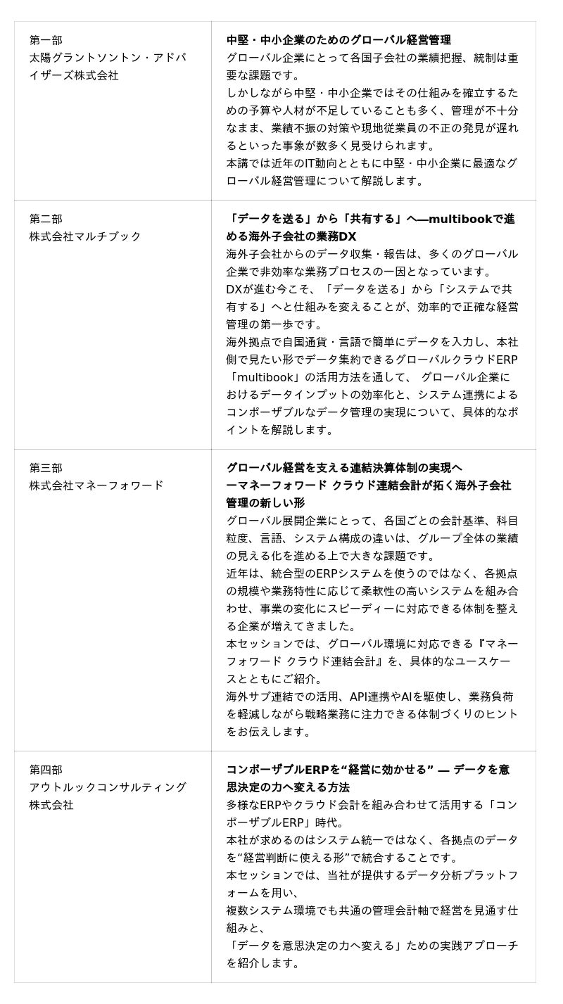 本講演は上記2社に加え、太陽グラントソントン・アドバイザーズ株式会社とアウトルックコンサルティング株式会社からゲスト講師を迎えてのセミナーとなります。