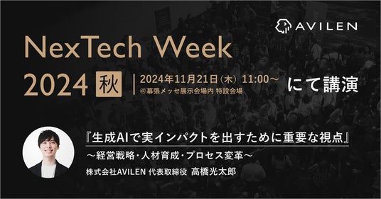 株式会社AVILEN(本社:東京都中央区、代表取締役:高橋 光太郎、以下「AVILEN」)は、2024年11月20日(水)~22日(金)に幕張メッセにて開催される「NexTech Week 2024 秋」に出展することをお知らせいたします。