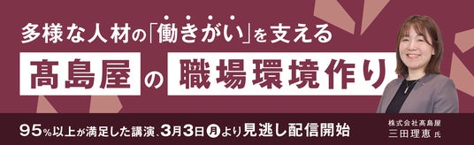 累計13,000社420万人以上の組織開発・人材育成を支援するALL DIFFERENT(オールディファレント)株式会社(所在地:東京都千代田区 代表取締役社長:眞崎大輔)は、2025年2月7日(金)に、株式会社高島屋より人事部ダイバーシティ推進室 室長 三田理恵氏をお招きし、「一人ひとりの働きがいを目指して 高島屋の職場環境づくりとその効果」というテーマでスペシャルセミナーを開催しました。参加した経営者・人事担当者の95%以上が「期待通り」・「期待以上」と回答した本セミナーを、3月3日(月)より期間限定で無料配信いたします。