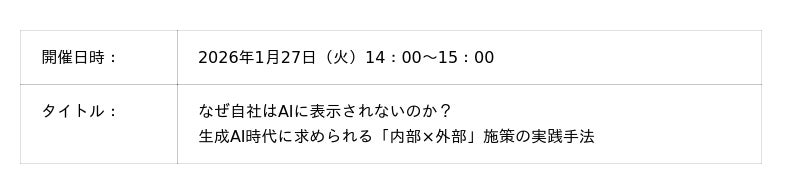 ■3社共催 無料オンラインセミナー詳細 本協業体制の構築に伴い、2026年1月27日(火)に3社共催による無料オンラインセミナーを開催いたします。生成AI時代の最新AIO戦略や具体的な活用事例について、各社の知見を