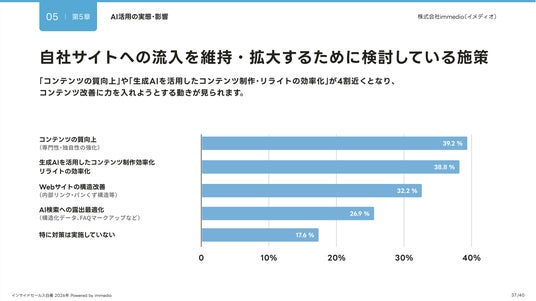 約4割が「コンテンツの質向上」を実施。検討中の施策でも、「コンテンツの質向上」や「生成AIによる制作・リライト効率化」が約4割を占め、