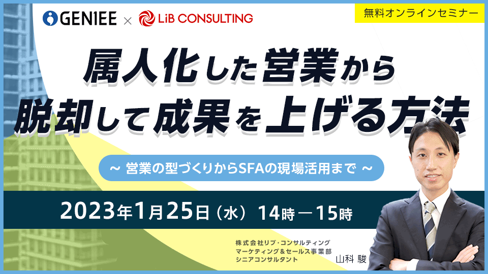 株式会社ジーニー(本社:東京都新宿区、代表取締役社長:工藤智昭、以下ジーニー)のSFA/CRM事業本部は株式会社リブ・コンサルティング(本社:東京都千代田区、代表取締役 :関 厳、以下 リブ・コンサルティング)と共同で、無料オンラインセミナー「属人化した営業から脱却して成果を上げる方法 ~営業の型づくりからSFAの現場活用まで~」を2023年1月25日(木)14時より開催いたします。