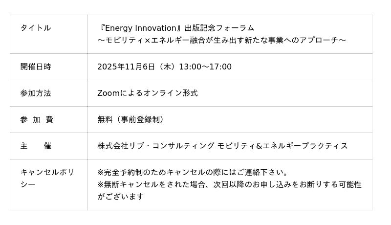 モビリティ・エネルギー業界に対するコンサルティング支援に強みを持つ株式会社リブ・コンサルティング(本社:東京都中央区、代表取締役:関厳、以下「当社」)はこの度、2022年に刊行した『モビリティ×エネルギー領域の融合 EVX』(プレジデント社)をアップデートした新たな書籍『Energy Innovation~モビリティ×エネルギー融合が生み出す新たな事業へのアプローチ~』(プレジデント社)を2025年11月中旬に出版する運びとなり、また、本書籍の出版を記念し、書籍のインタビューにご協力を頂いた企業様に登壇を頂くフォーラムイベントの開催ををお知らせします。