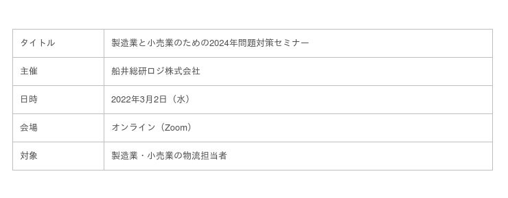 ロジスティクス・物流コンサルティングサービスを提供する船井総研ロジ株式会社(東京本社:東京都千代田区、代表:菅重宏、以下「船井総研ロジ」)は、荷主企業(製造・小売)を対象に、2024年問題の構造とリスク、具体的な対策方法を解説するセミナーを2022年3月2日(水)にオンラインで開催しました。