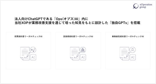 株式会社クロス・オペレーショングループ先端技術と業務(Ops)の融合に強みを持ち、生成AIを活用した業務改善支援を行う株式会社クロス・オペレーショングループ(東京都千代田区、代表取締役:田中亮大、以下XOP)は、自社で開発する法人向けChatGPT「OpsAI」(オプスAI)内に、独自プロンプトを搭載させたGPTsとして、【売買契約書リーガルチェックAI】【賃貸借契約書リーガルチェックAI】【業務委託契約書リーガルチェックAI】の提供を開始したことをお知らせいたします。※Ops / オプス=Operations / オペレーションの略称