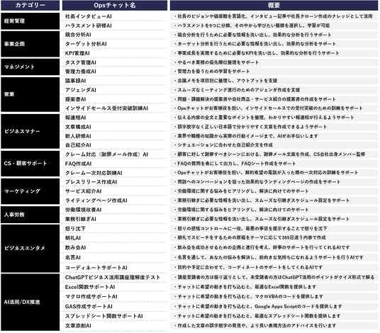 今回リリースした3つ以外にも、既に法人向けChatGPT「Ops(オプス)AI」には当社独自開発のGPTsが搭載されています。