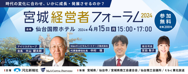 M&Aキャピタルパートナーズ株式会社(東京都中央区・代表取締役社長 中村 悟) は、昨年に引き続き、河北新報社と共催で、宮城県内の企業が成長・発展をしていくために取るべき経営戦略について講演をする「宮城経営者フォーラム2024」を開催いたします。