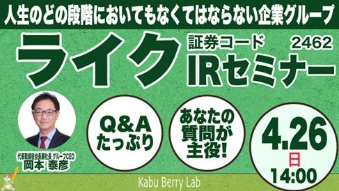 保育・人材・介護の事業を展開するライク株式会社(東京本社:東京都渋谷区、代表取締役会長兼社長 グループCEO:岡本 泰彦、以下 ライク)は、個人投資家の皆さまに対するIR活動の一環として、2026 年4月26日(日)に開催されますKabu Berry Lab IRセミナーに参加することとなりましたので、下記のとおりお知らせいたします。