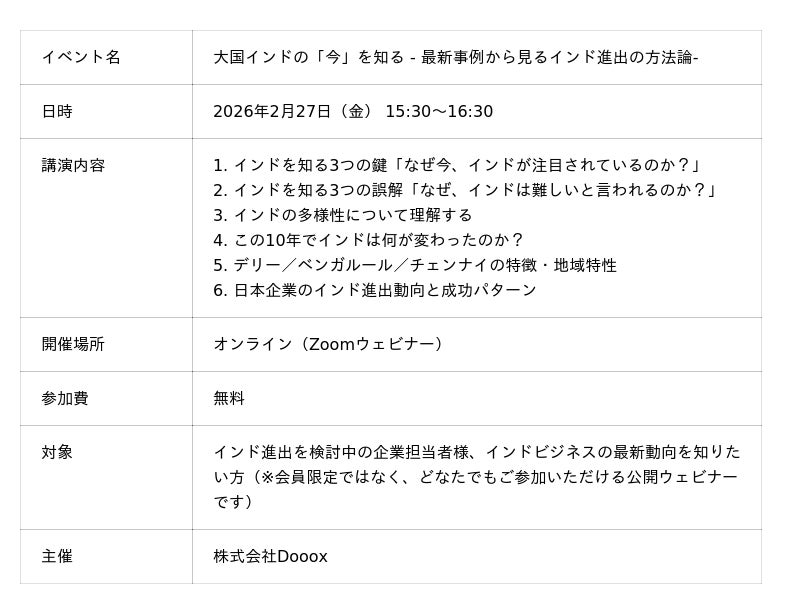 “行動で世の中を変えていく“を理念に掲げる株式会社Dooox(東京都品川区、代表取締役 久保寺亮介/以下「当社」)が運営するインド進出支援プラットフォーム「Do Lab India」は、この度、日本企業のための公開ウェビナー「大国インドの『今』を知る - 最新事例から見るインド進出の方法論 -」を2026年2月27日(金)にオンラインで開催いたします。本ウェビナーでは、Global Japanの田中氏を講師にお招きし、インド市場の最新動向や、地域ごとの特性、日本企業が成功を収めるための具体的なパターンを徹底解説いただきます。■ セミナー開催の背景世界的に注目を集めるインド市場は、その巨大な人口と成長性から、日本企業にとって見逃せないフロンティアです。しかし、独特な商習慣や複雑な法制度など、進出には高いハードルが存在するのも事実です。
