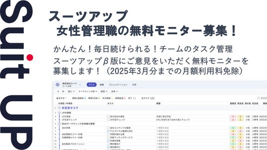 株式会社スーツ(所在地:東京都千代田区、代表取締役社長CEO:小松 裕介)は、チームでかんたん、毎日続けられるプロジェクト・タスク管理ツールの経営支援クラウド「Suit UP」(スーツアップ)において、女性管理職の無料モニターを募集いたします。