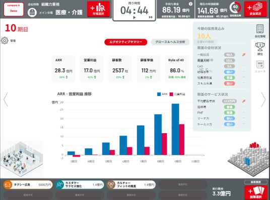 ゲーム内のスタートアップ企業をリアルに近い形でシミュレーション経営し、8期でARR100億円の達成を目指すゲームです。資本政策の策定、採用、マーケティング、セールス、プロダクト開発などの経営施策を行いながら、リアルな経営判断を体験できます。