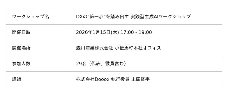 『緊急ではないけれど、重要な課題』について、企業経営者に伴走する特命社長室(R)︎を展開する株式会社Dooox(本社:東京都品川区、代表:久保寺亮介/以下「当社」)は、2026年1月15日(木)、森川産業株式会社(本社:東京都中央区、代表取締役社長:二瓶康裕)の本社オフィスにて、「DXの"第一歩"を踏み出す 実践的生成AIワークショップ」を開催いたしました。当日は、当社執行役員の末廣修平が講師を務め、全国から集まった社長、役員を含む29名の社員の皆様にご参加いただきました。