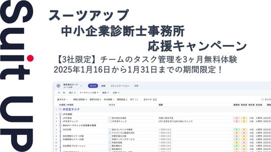株式会社スーツ(所在地:東京都千代田区、代表取締役社長CEO:小松 裕介)は、チームでかんたん、毎日続けられるプロジェクト・タスク管理ツールの経営支援クラウド「Suit UP」(スーツアップ)において、中小企業診断士事務所応援キャンペーンを実施いたします。