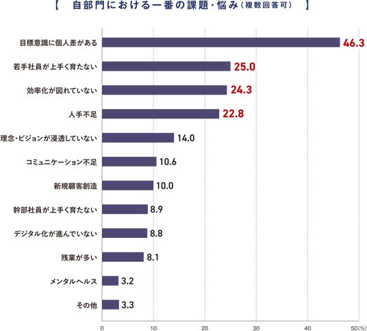 (1)約半数が「目標意識に個人差がある」ことが自部門の課題・悩みと回答。 自部門における一番の課題として「目標意識に個人差がある」(46.3%)が最も多い結果となりました。組織・チームメンバーに対して「今、何が大事か。何をすべきか」の判断基準をわかりやすく伝え、いかにして浸透させ、組織・チームとして一体感を持たせていくかが求められます。