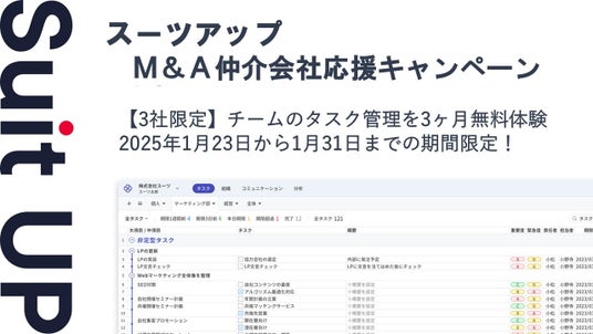 株式会社スーツ(所在地:東京都千代田区、代表取締役社長CEO:小松 裕介)は、チームでかんたん、毎日続けられるプロジェクト・タスク管理ツールの経営支援クラウド「Suit UP」(スーツアップ)において、M&A仲介会社応援キャンペーンを実施いたします。