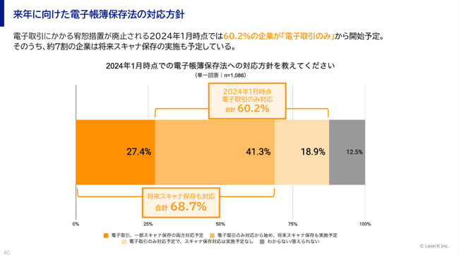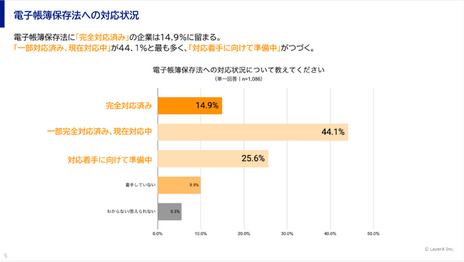 すべての経済活動のデジタル化を目指す株式会社LayerXは、「バクラク」において、2023年12月に宥恕(ゆうじょ)措置が廃止される電子帳簿保存法の対応を担当している1,100名を対象に、電子帳簿保存法への対応実態調査を実施しました。