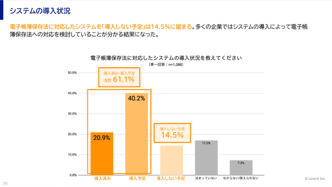 3. 法対応に向けたシステム導入について、61.1%が「導入済み」・「導入予定」、「導入しない予定」は14.5%電子帳簿保存法に対応したシステムの導入状況についてを質問したところ、「導入済み」20.9%、「導入予定」40.2%となり、合わせて61.1%が導入すると回答しました。「導入しない予定」と回答したのは14.5%でした。