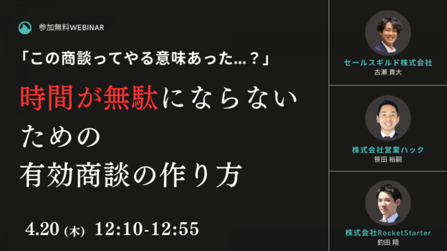 株式会社営業ハック(本社:東京都港区・代表:笹田裕嗣)とセールスギルド株式会社(本社:東京都板橋区・代表:古瀬貴大、)株式会社RocketStarter(本社:東京都中央区・代表:釣田翔)が共催ウェビナーを行います。日時は2023年4月20日(木)12:10~12:55、参加費は無料です。有効商談率を上げたい、無駄な商談をなくし効率よくしていきたい。そんな願いを叶えるために必要なことをまとめて解説させていただきます。商談を行う営業必見・必聴のウェビナーとなっています!