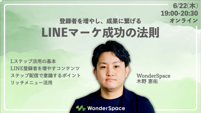 株式会社WonderSpace(本社:東京都港区、代表取締役社長:山本 尚宏)は、『登録者を増やし、成果に繋げるLINEマーケ成功の法則』をテーマにしたウェビナーのアーカイブ配信を開始しました。(お申し込み:https://wonderspace.co.jp/seminar/seminar-3824/)