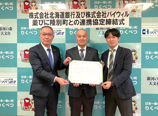 日本全国47都道府県のカーボンニュートラル実現を目指す株式会社バイウィル(本社:東京都中央区、代表取締役社長:下村 雄一郎、以下「バイウィル」)は、北海道足寄郡陸別町(町長:本田 学、以下「陸別町」)、株式会社北海道銀行(本店:北海道札幌市、取締役頭取:兼間 祐二、以下「北海道銀行」)と、カーボンニュートラルおよびサーキュラーエコノミーの実現を目指し、連携協定を締結しました。