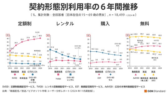 本リリースでは、契約形態、観賞形態を横断した利用率の推移や、SVOD(定額制動画配信)の平均利用サービス数に着目し、レポートから抜粋する形で、ユーザーの利用実態をお知らせいたします。