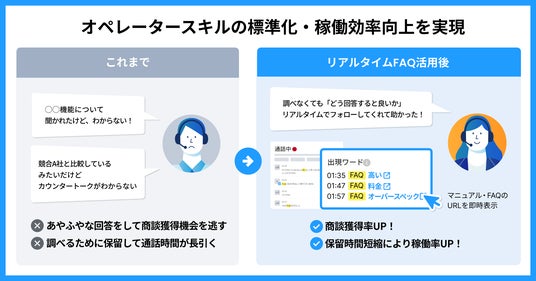 お客様からの問い合わせ対応や営業架電、いずれの場合でも、電話応対時に即答が難しい質問を受けた場合にはFAQやマニュアルを検索・参照しながら回答する必要があります。このたびの「リアルタイムFAQ」リリースにより、経験の浅いユーザーも通話中に必要なマニュアル・FAQを即時に参照しながら応対できるようになります。これにより、ユーザーの応対スキルの平準化を実現すると同時に、ユーザーが持っていない知識を個別に教える管理者の教育工数も軽減することができます。
