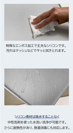 特殊なエンボス加工で丈夫なシリコンです。汚れはティッシュでサッと拭きとれます。