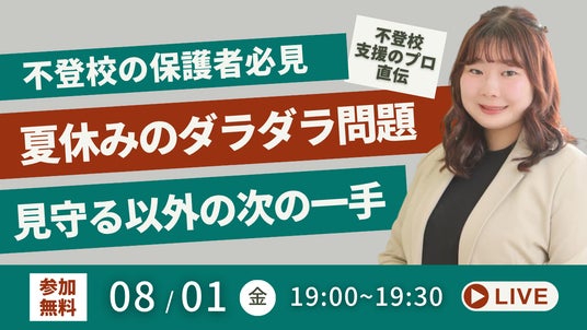 2025年8月1日(金)19:00~19:30、キズキ共育塾(※)は「夏休みにダラダラ過ごす不登校のお子さん」について悩む保護者様を対象に、無料のオンラインイベントを開催します。