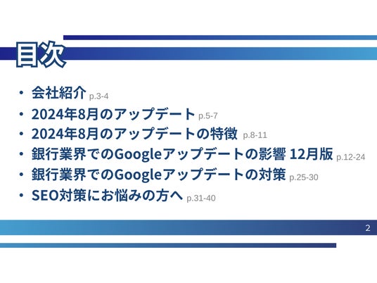 「銀行業界でのアップデートの影響」では、実際の事例をもとに、アップデートによる順位変動と対策を解説しています。アップデートの特徴や、業界におけるSEO対策の重要ポイントにも注目です。
