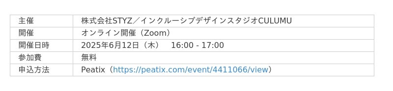 株式会社STYZ(東京都渋谷区、田中辰也 代表取締役社長)は、当社内で運営するインクルーシブデザインスタジオCULUMU(くるむ)主催のオンラインセミナーを2025年6月12日(木)16時から開催します。
